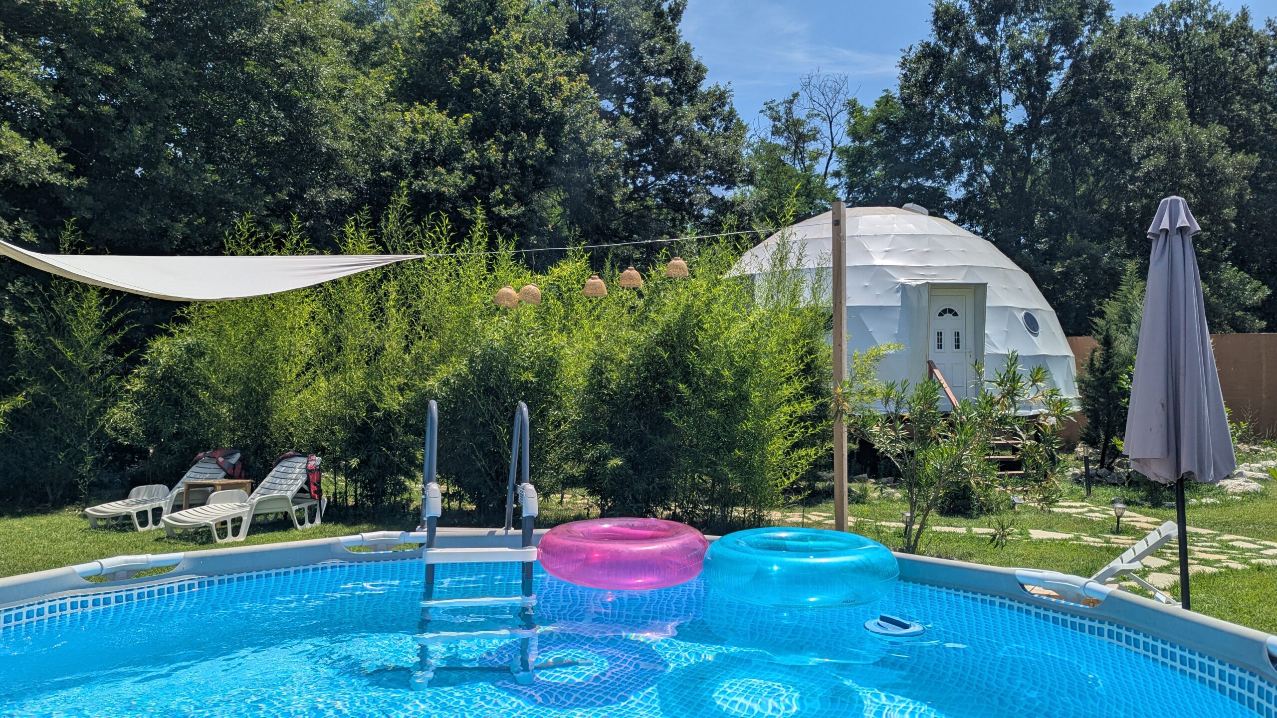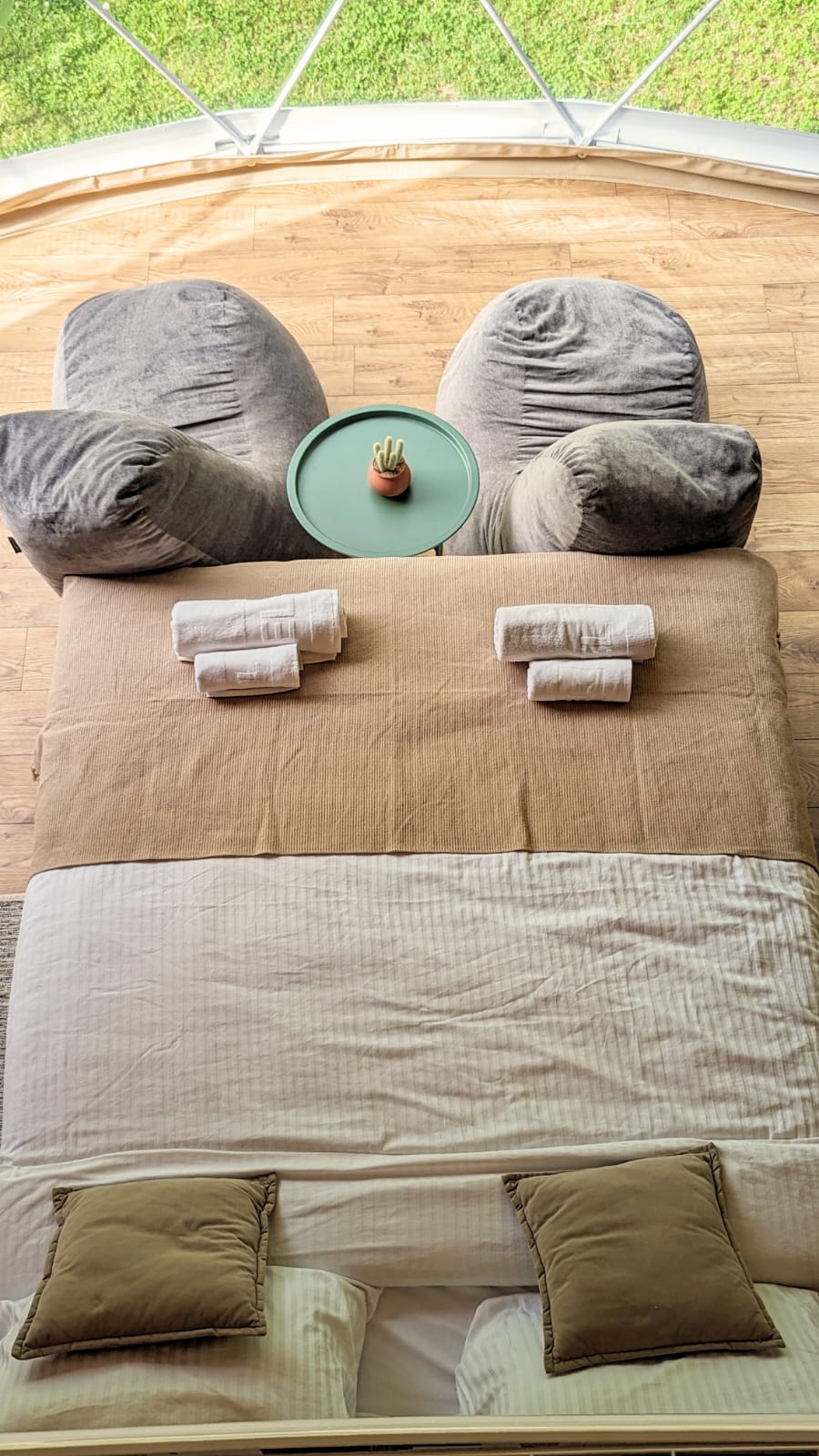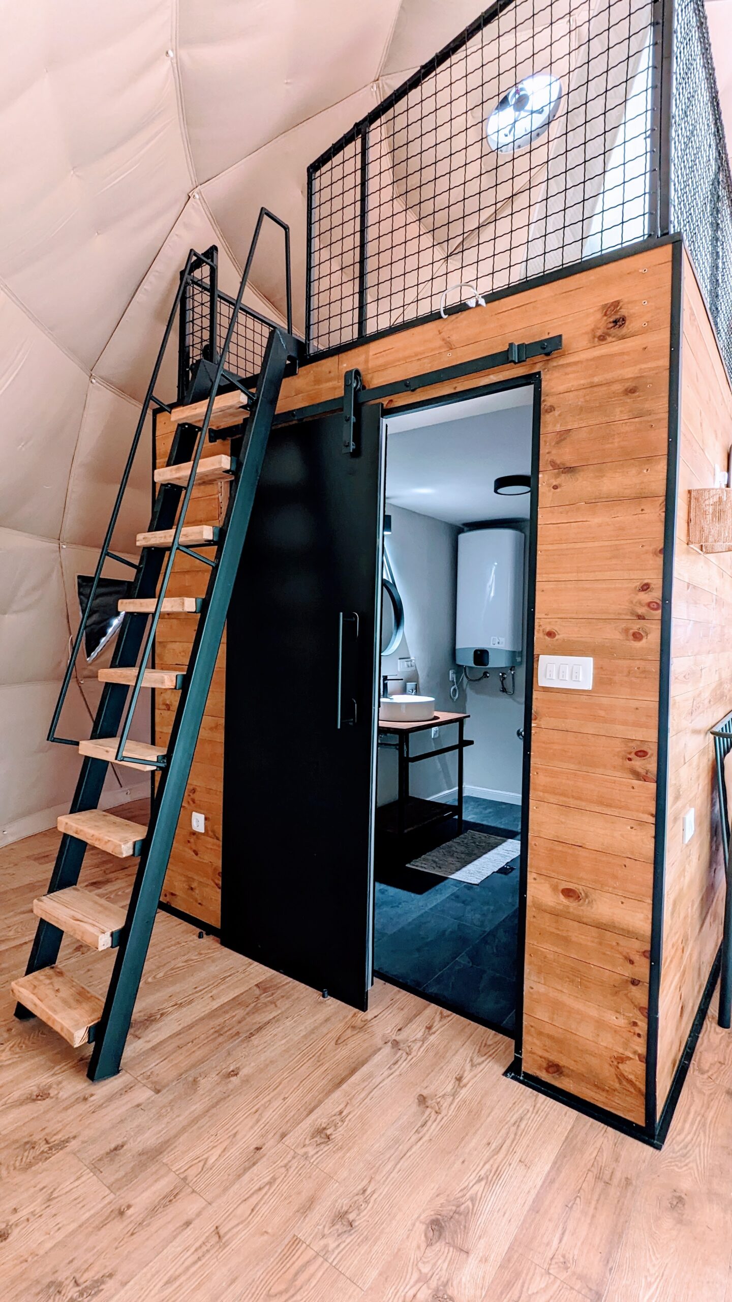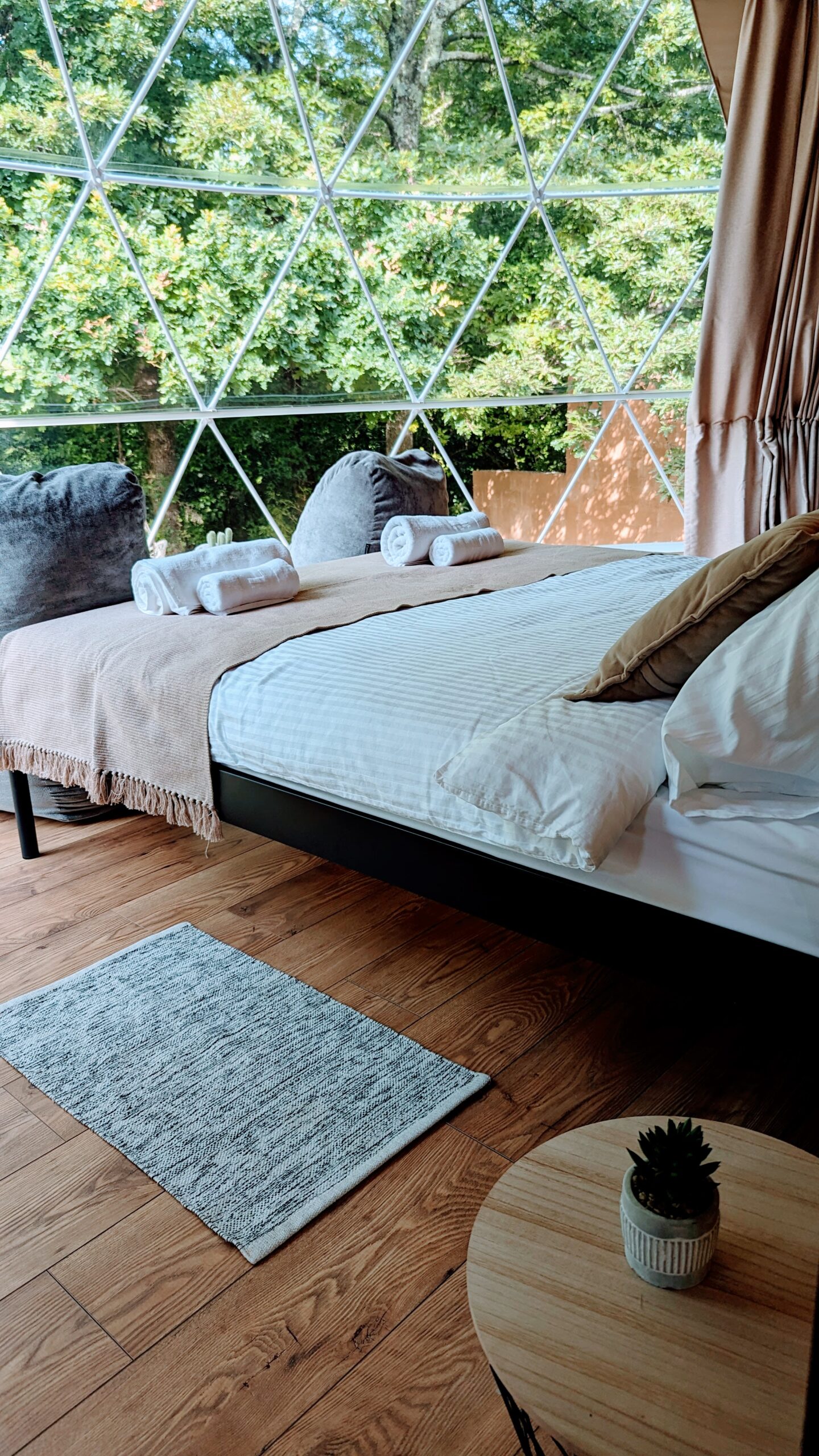 Our 50m² geodesic dome offers a luxurious stay in nature, with a double bed, private bathroom, gallery with two single beds, A/C, Wi-Fi, and a panoramic window facing the Zata River. A perfect mix of comfort and natural beauty.